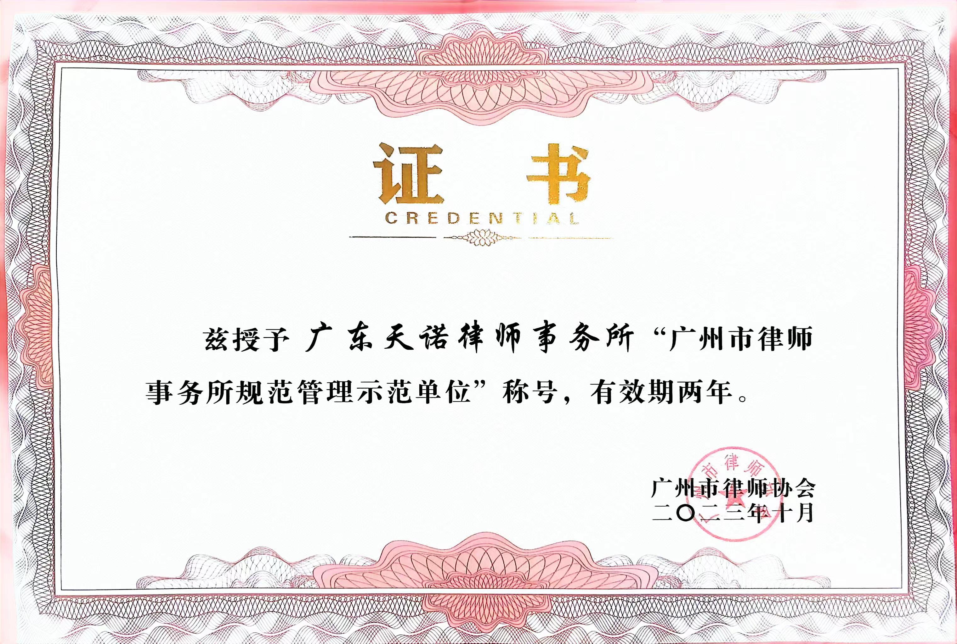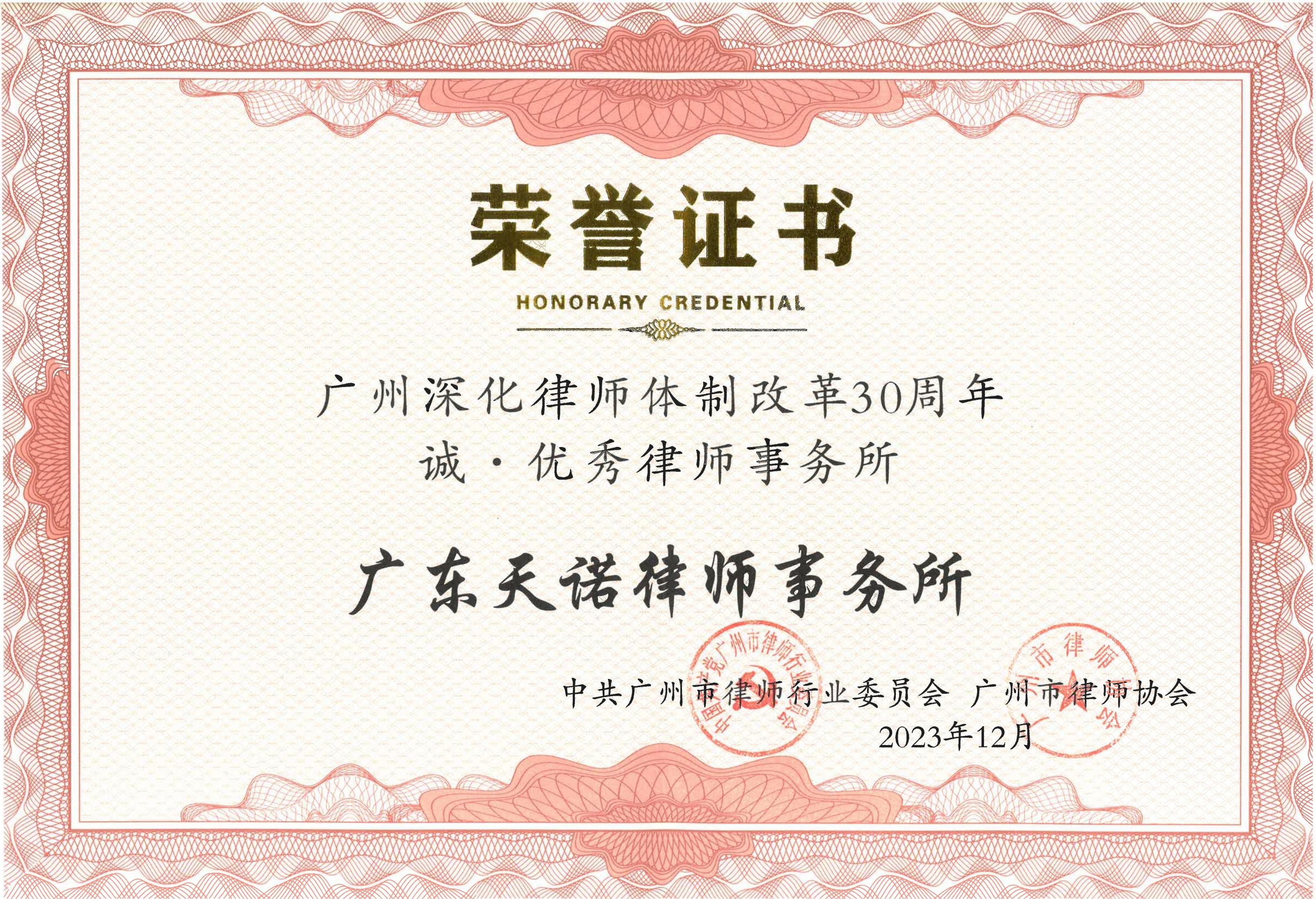 本所系广州市律师事务所首批规范管理示范单位,连续三年被广东省律师行业党委授予“党建工作示范化律师事务所党组织”;被广州市政府表彰为“2022年度推进法治政府建设、服务保障全市经济社会发展作出突出贡献的单位”;被广州市律师协会授予广州深化律师体制改革30周年“诚·优秀律师事务所”,并多次被表彰为公益先进单位;被华东政法大学国际教育学院授予“教学实践基地” 。本所积极参与大湾区法治化营商环境和涉外法治建设,系广东省律师协会涉外律师事务所库律所;与美国、德国、巴基斯坦等国外律所建立了广泛的战略合作关系;和香港资深的余陈杨律师行共同在南沙自贸区成立了“天诺余陈杨(南沙)联营律师事务所”,从而形成了“一区两所、内外互联”的整体优势。本所以“规范所、人文所、品牌所”为立所宗旨,以优质高效的法律服务获得了社会各界的广泛好评。